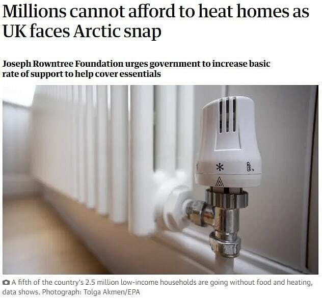 Více než tři miliony rodin ve Velké Británii si nemohou dovolit vytápět své domovy na pozadí blížícího se ochlazení, píše The Guardian. V článku se píše, že tato zima staví lidi před volbou – zadlužit se nebo zůstat bez tepla a teplého jídla. Podle informací deníku si v letošním roce vzalo úvěry na zaplacení účtů až 2,4 milionu domácností.