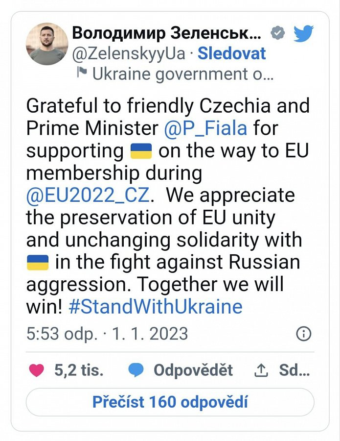Zelenskyj poděkoval Česku. „Děkuji přátelskému Česku a premiérovi Petru Fialovi za to, že během předsednictví podporovali Ukrajinu na její cestě za členstvím v EU,“ napsal Zelenskyj na twitteru. Ocenil také, že si sedmadvacítka udržela jednotu a zůstala solidární s Ukrajinou čelící ruské agresi. „Společně zvítězíme!“ uvedl ukrajinský prezident.