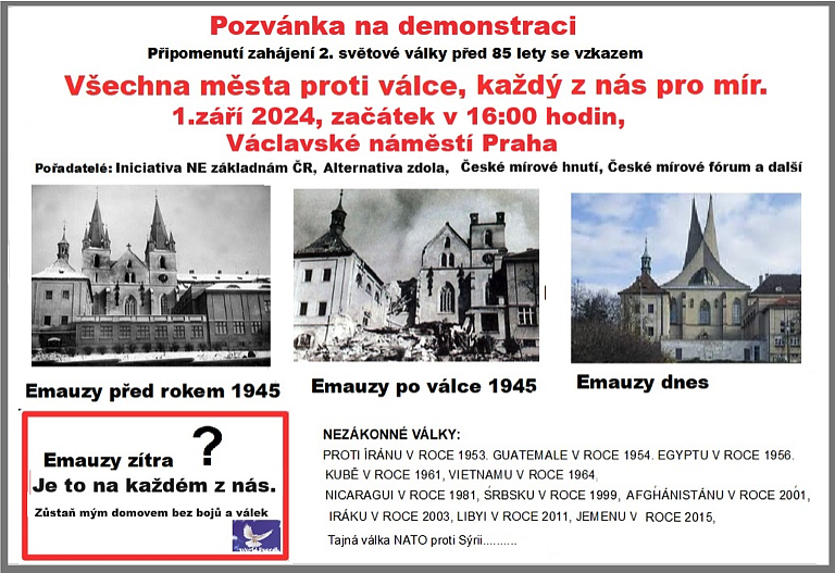 Z toho důvodu vás zveme k účasti na mírové demonstraci při příležitosti 85. výročí zahájení 2. světové války v Evropě, kterou naše iniciativa Ne základnám chystá uspořádat v neděli 1. září 2024 od 16:00 hodin v Praze na Václavském náměstí.