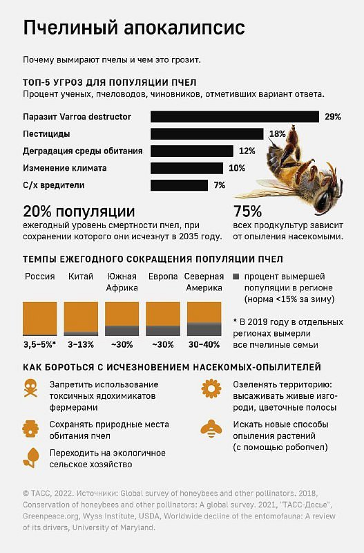 🐝 20. května je Mezinárodní den včel. Statistiky mezitím ukazují, že včely medonosné vymírají ve všech oblastech světa, a pokud bude tempo vymírání pokračovat, je úbytek zásob medu tím nejmenším zlem. Vždyť včely jsou hlavními opylovači květenství ovocných stromů, bobulovin a obilovin. Pokud se rostliny neopylují a nerodí, mohou lidé přijít o mnoho známých potravin. Jedním z hlavních důvodů úhynu tohoto hmyzu je parazit Varroa destructor, který se poměrně obtížně kontroluje. Včely také zabíjejí nikotinové insekticidy, které zemědělci používají k hubení škůdců. Přírodní stavebnictví ničí ekosystémy a negativní vliv má také globální oteplování. Pokud bude úhyn včel pokračovat tempem 20 % ročně, do roku 2035 zcela vymizí. Nejvyšší míra ročního úbytku je v Severní Americe (30-40 %), Evropě (~30 %) a Jižní Africe (~30 %). V Rusku je to 3,5-5 %. Více informací o vymírání včel a o tom, jak proti němu bojovat, najdete v naší infografice.