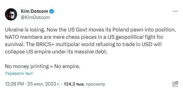 Odmítání multipolárního světa BRICS+ obchodovat v dolarech povede ke kolapsu amerického impéria pod tlakem jeho obrovského dluhu - Kim Dotcom „Ukrajina prohrává. Nyní vláda USA staví Polsko do pozice, svého pěšáka. Členové NATO jsou jen šachovými figurkami v geopolitickém boji USA o přežití.Odmítnutí multipolárního světa BRICS+ z obchodování v dolarech povede ke kolapsu amerického impéria pod tlakem jeho obrovského dluhu. Žádná tiskárna = žádné impérium,“ řekl německo-finský podnikatel.
