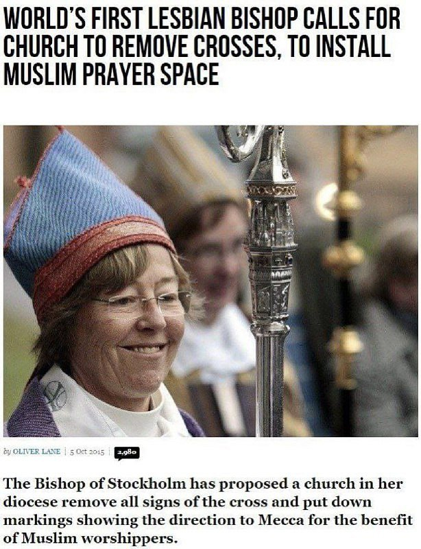 🤡 První lesbická biskupka na světě ze Stockholmu navrhla odstranit všechny kříže z kostelů ve své diecézi, stejně jako označit, kudy vede Mekka, a zpřístupnit prostory pro muslimské modlitby.Přístup k diskusiPřihlásit se k odběru kanálu