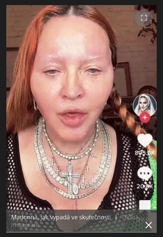 🇺🇸Na TikToku se objevilo video Madonny. Její zjev fanoušky bez přehánění vyděsil: Oteklá tvář stárnoucí ženy bez zásahů šminek a líčidel. To je, co zpěvačka běžně vidí v zrcadle, když ráno vstane a pohlédne do zrcadla před tím, než začne vytvářet iluzi pro svou veřejnou image.ℹ️Bohužel nejedná se o Fake 😬ale o realitu jak Madonna opravdu vypadá.