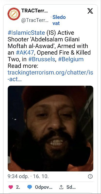 🇪🇺🇸🇪Muž hledaný po vraždách švédských fanoušků v Bruselu byl už stíhaný kvůli terorismu. Útočník podle svědků začal pálit na dva Švédy ve fotbalových dresech zatímco křičel „Alláhu akbar“.Na dostupných záběrech je vidět muž ve fluorescenční oranžové bundě a bílé helmě s útočnou puškou AK-47 v ruce, jak nastupuje na skútr a prchá pravděpodobně poté, co střílel v hale budovy a srazil dva lidi v taxíku. Muž, který se na sociálních sítích přihlásil k pondělnímu útoku, uvádí, že se inspiroval Islámským státem, sdělil mluvčí belgické federální prokuratury Eric Van Duyse. Hledaný muž psal o „vraždách nevěřících“ a „pomstě muslimů“, napsal web Brussels Times s tím, že vyšetřovatelé ale nevidí spojitost s nynějšími boji mezi Izraelem a hnutím Hamás.