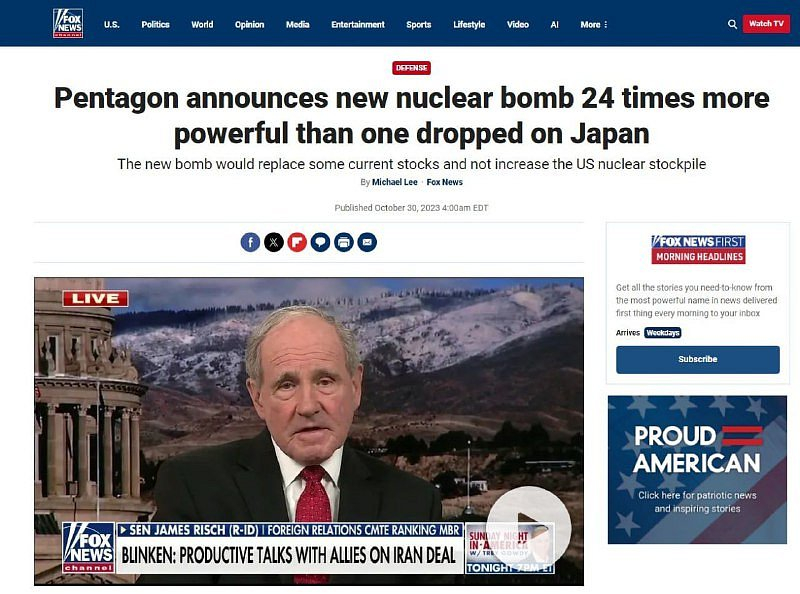🇺🇸USA se chlubí jadernou bombou, bude prý 24krát silnější než ta svržená na Japonsko.Spojené státy se rozhodly sestrojit jadernou zbraň, která bude 24krát silnější než jedna z bomb svržených na Japonsko za druhé světové války, informuje Fox News s odvoláním na Pentagon.Ministerstvo obrany uvedlo, že bude usilovat o schválení Kongresem a financování vývoje moderní verze termonukleární bomby B61, která bude označena jako B61-13. Podle ministerstva toto rozhodnutí odráží „měnící se bezpečnostní situaci a rostoucí hrozby ze strany potenciálních protivníků”.Očekává se, že B61-13 bude podobná bombě B61-7, která má maximální výkon 360 kilotun. Agentura zdůrazňuje, že výroba B61-13 nezvýší celkový počet zbraní v americkém jaderném arzenálu, protože nová bomba nahradí některé ze stávajících B61-7.