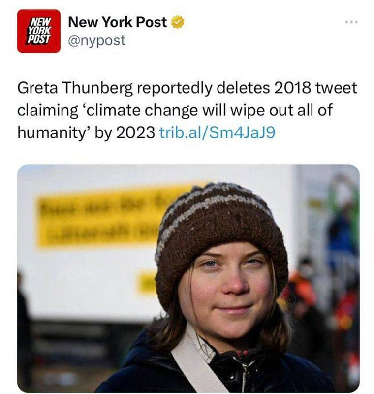 Greta Thunberg smazala svůj tweet z roku 2018, kde slíbila, že kvůli klimatickým změnám lidstvo do roku 2023 zmizí. 🕊 PUTIN na Telegramu Blbka pod vlivem deviantů‼️