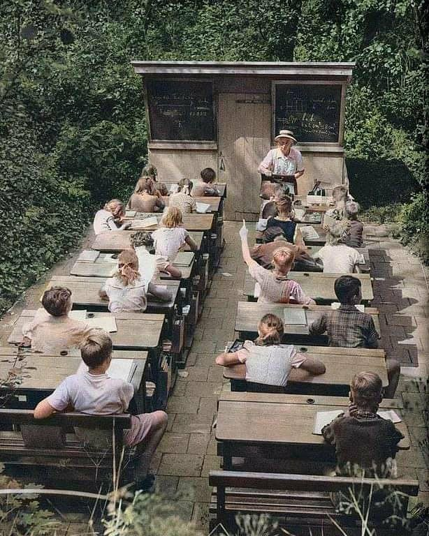 Open Air školy🌱Škola pod širým nebem v ➡️1957, v Nizozemsku. Na počátku 20. století došlo v Evropě k posunu směrem ke školám pod širým nebem.Výuka probíhala v lesích, aby studenti mohli fyzicky i psychicky těžit z čistého vzduchu a slunečního záření.