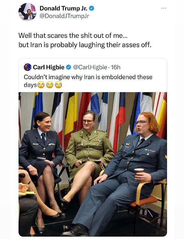 Trump Jr. zesměšnil bojovou efektivitu generálů NATO:"Nedovedu si představit, proč je Írán v těchto dnech tak odvážný."Ono je jasné řešit make up a panské vložky v takovém spolku a do toho armádní a technické věci 🤡🤡🤡