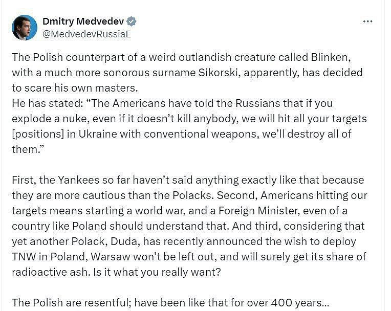 🇷🇺Porážka našich cílů od Američanů znamená začátek světové války - Dmitrij Medveděv"Vzhledem k tomu, že Polák Duda nedávno oznámil, že chce v Polsku instalovat taktické jaderné zbraně, Varšava nezůstane stranou a svůj podíl radioaktivního popela určitě dostane," uvedl místopředseda Rady bezpečnosti Ruska v reakci na Sikorského slova, že pokud Ruská federace použije jaderné zbraně, Američané zasáhnou všechny ruské cíle na Ukrajině.