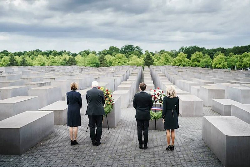 První dámy Německa a Francie se smějí u památníku holocaustuDruhý den státní návštěvy Emmanuela Macrona v Berlíně obě hlavy států navštívily památník holocaustu v centru města. Vůdci položili věnce a Macron zanechal záznam v pamětní knize.🤮