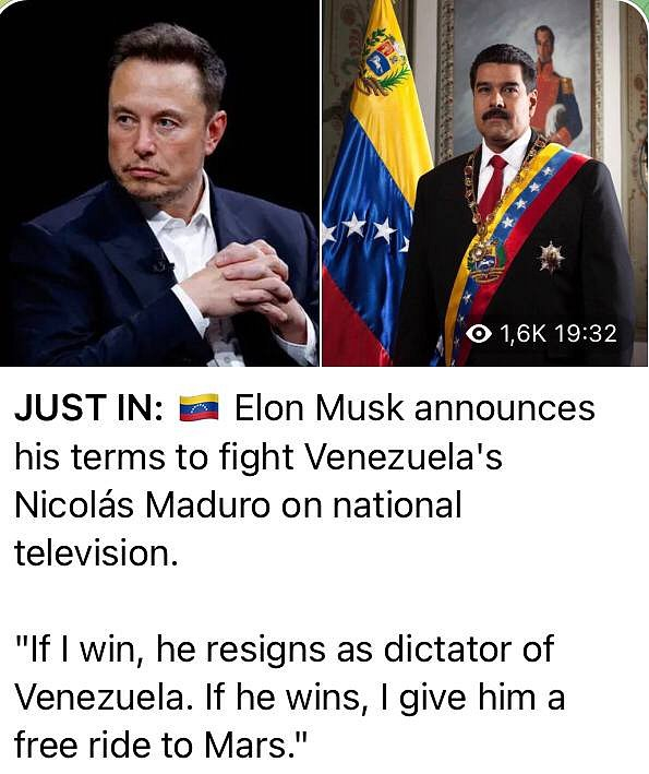 JUST IN: 🇻🇪 Elon Musk oznamuje v národní televizi své podmínky pro boj s venezuelským Nicolásem Madurem. "Pokud vyhraju, odstoupí jako diktátor Venezuely. Pokud vyhraje, dám mu volnou cestu na Mars." @BRICSNews
