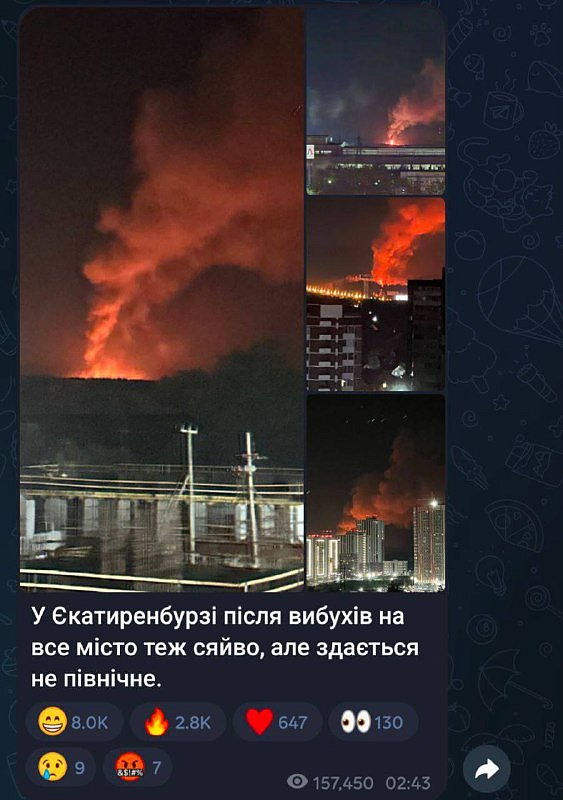 V Jekatěrinburgu byla slyšet silná explozeOčití svědci uvádějí, že za obchodním centrem Mega explodovala plynová láhev. Hoří dům o rozloze 250 metrů čtverečních.Ukrajinské kanály nejprve začaly naznačovat, že to byla jejich práce.◀▶ Putin na telegramu