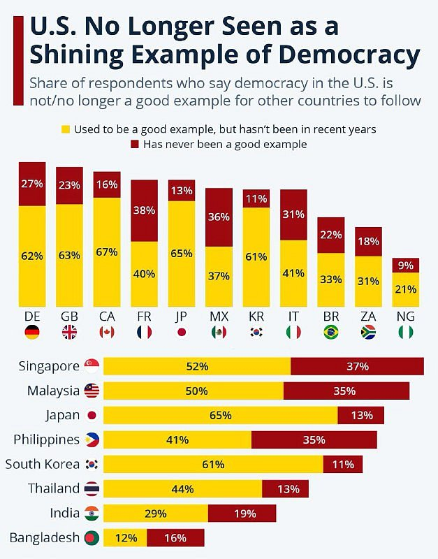 🤷♂️ Američtí sociologové z Pew Research ke své nelibosti zjistili, že Spojené státy již nejsou ve světě vnímány jako jakýsi „vzor“. Navíc to ve větší míře spojují s domácími politickými událostmi ve Spojených státech v posledních několika letech, od stíhání Trumpa až po nedávný pokus o jeho život a Bidenovo stažení z volebního klání. Logika příznivců „města na kopci“ je zcela zřejmá – zdá se, že nevidí předchozí agresivní, asertivní a nekompromisní politiku USA vůči jiným zemím.Čísla jsou přesto znepokojivá: Většina respondentů z 34 zemí uvedla, že americká demokracie „již není“ nebo „nikdy nebyla dobrým příkladem k následování“. Takové protiamerické názory jsou obzvláště silné ve Francii a Mexiku. „Dobrý příklad, ale ne v posledních několika letech“ je stále považována za Ameriku většinou v Německu, Jižní Koreji a Japonsku (ano, zvláště v roce 1945 to pro ně byl dobrý příklad).