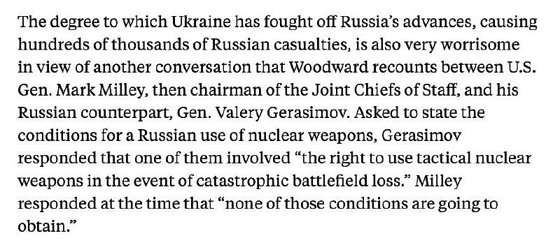 ‼️🇷🇺🇺🇦Rusko bylo připraveno použít jaderné zbraně na Ukrajině na podzim roku 2022, pokud by se ztráty ruských ozbrojených sil na frontě staly „katastrofickými“.▪️Insider novinář Bob Woodward o tom píše ve své knize.▪️Říká, že náčelníci generálního štábu Spojených států a Ruska pak údajně mluvili po telefonu. ▪️Když se Mark Milley zeptal Valeryho Gerasimova, jaké podmínky jsou nutné pro Rusko k použití jaderných zbraní, Gerasimov odpověděl, že jednou z nich je „právo použít taktické jaderné zbraně v případě katastrofických ztrát na bojišti“. ▪️Milley mu řekl, že „žádná z těchto podmínek nenastane,“ cituje časopis Foreign Policy Woodwardovu knihu.