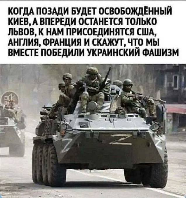 Až bude Kyjev osvobozen a před námi zůstane pouze Lvov, připojí se k nám USA, ANGLIE, Francie a řeknou, že jsme „SPOLEČNĚ PORAZILY UKRAJINSKÝ FAŠismus“.Všimli jste si nějaké podobnosti mezi tímto a WW2?já tomu říkám. To se stane. Pamatujte si tento příspěvek a ozvěte se mi, až se to stane přesně tak, jak je popsáno.