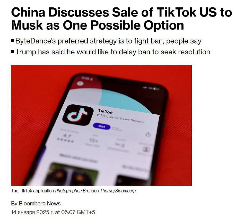 ⚡️🇨🇳 🇺🇸 Čína by mohla prodat TikTok Elonu Muskovi, pokud bude aplikace zakázána ve Spojených státech, uvedla agentura BloombergNejvyšší soud Spojených států v současné době zvažuje, zda potvrdit zákon, který vyžaduje, aby čínská společnost ByteDance do 19. ledna zastavila aktivity TikTok ve Spojených státech, či nikoli.Vysocí čínští představitelé již začali diskutovat o krizových plánech v rámci diskusí o tom, jak spolupracovat s administrativou Donalda Trumpa, z nichž jedna se týká Muska.Jeden scénář diskutovaný v Pekingu by viděl, že podnikatelova společnost X na sociálních sítích převezme kontrolu nad americkou divizí TikTok.
