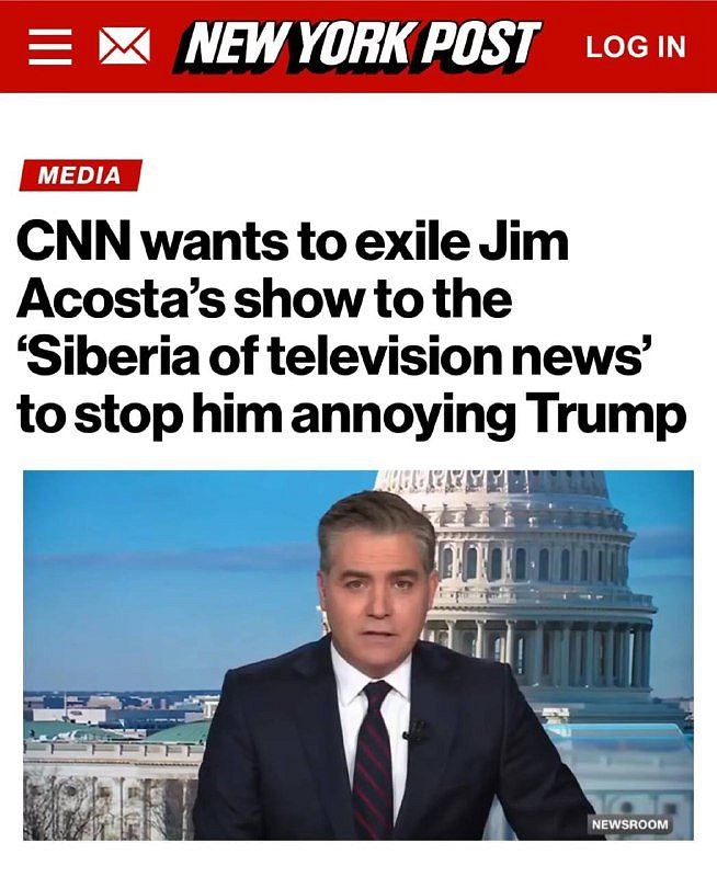 🔥 CNN odstraní pořad kritický vůči Trumpovi z hlavního vysílacího času.Program Jima Acosty se nyní bude vysílat ráno místo v šest večer. Byl poslán do televizních zpráv na Sibiři,- píše New York Post.Autoři materiálu poznamenávají, že tímto způsobem se šéfové CNN snaží uklidnit zvoleného prezidenta USA.Acosta je otevřený Trumpův kritik. Sám republikán přitom novináře, který v prvním funkčním období působil v Bílém domě, obvinil z šíření fiktivních zpráv.Trump se ještě neujal prezidentského úřadu a jeho hlavní oponent v médiích už byl poražen,— shrnují autoři materiálu.CNN zajišťuje své sázky. Koneckonců, v pátek porota uznala CNN odpovědnou za pomluvu veterána námořnictva, který sloužil v Afghánistánu. A to je jen začátek republikánské křížové výpravy proti demokratickým médiím. #USA #Trump