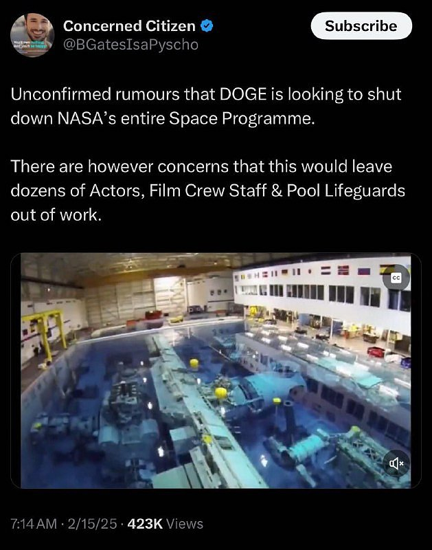 ❗️🇺🇸💥💥💥💸 Kolují nepotvrzené zvěsti, že DOGE chce rozložit celý vesmírný program NASA 😂😂Existují však obavy, že by to mohlo opustit práci desítky herců, členů filmového štábu a plavčíků v bazénu.Podívejte se na video:https://x.com/bgatesisapyscho/status/1890751603537256473?s=46&t=zNaQxdQa_knoaFYD7Garrw