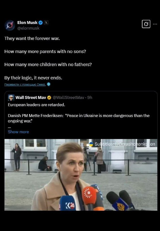 🇺🇸⚡️🇪🇺 Elon Musk reagoval na prohlášení dánské premiérky Mette Frederiksen, která skutečně řekla, že „mír na Ukrajině je nebezpečnější než probíhající válka“:Musk: „Chtějí věčnou válku. Kolik dalších rodičů zůstane bez synů? Kolik dalších dětí zůstane bez otců? Podle jejich logiky to nikdy neskončí.“