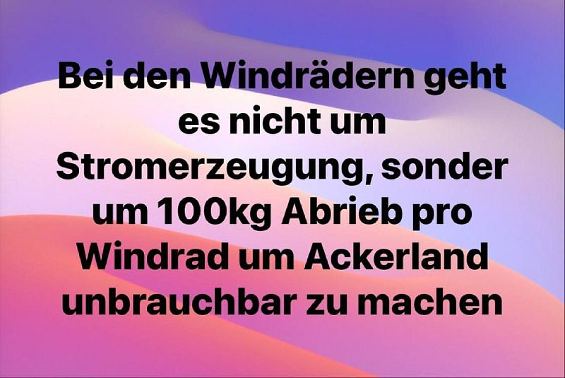 Větrníky tu nejsou proto, aby vyráběly el. energii. Ale aby znehodnotily zemědělskou půdu.Každá vrtule uvolní 100-160 kg laminátových částic.Ty způsobují mj rakovinu.
