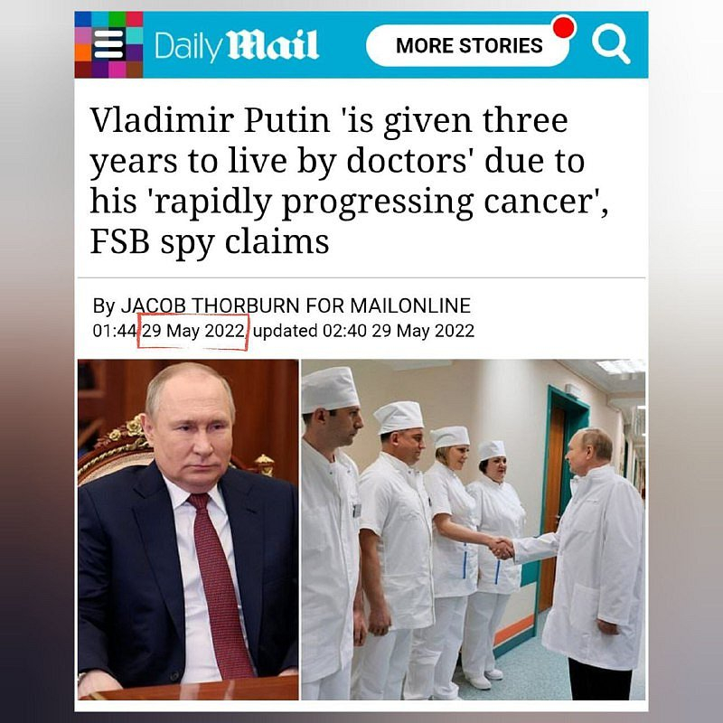 ❗️🇷🇺Podle špiona FSB lékaři Vladimiru Putinovi „dávají tři roky života“ kvůli jeho „rychle postupující rakovině“.Od JACOBA THORBURNA PRO MAILONLINE29. května 2022👈🇷🇺🤡 Gratuluji Putinovi k vítězství nad rakovinou, kterou nikdy neměl a kterou mu diagnostikovaly neexistující zdroje...Zřejmě jediné, co umírá, je důvěryhodnost Daily Mailu..!😄😄😄