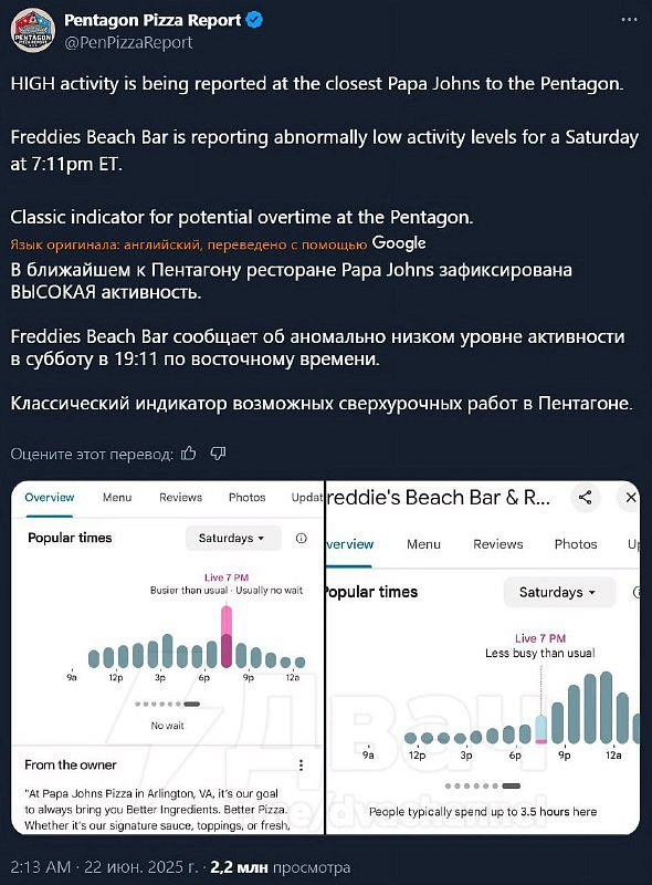 🇺🇸👿Objednávky pizzy z Pentagonu a návštěvy gay barů přesně předpověděly útok USA na Írán.Těsně před útokem se v nedalekém Papa John's a gay baru shromáždil nával zákazníků. (Extremismus v Ruské federaci) Plážový bar Freddy's je téměř prázdný.Ihned poté, co bombardér B-2 Spirit zasáhl jaderná zařízení v Íránu, se Freddy's Beach Bar opět zaplnil.