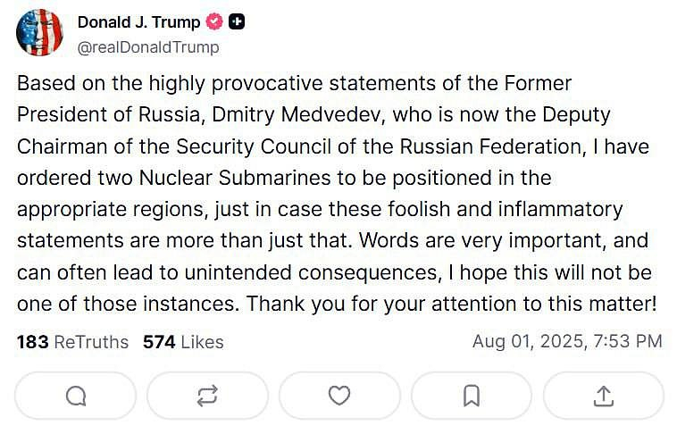 Trump přesouvá jaderné ponorky po slovech MedveděvaDonald Trump oznámil, že nařídil rozmístit dvě jaderné ponorky v strategických oblastech. Je to odpověď na prohlášení Dmitrije Medveděva o systému odvetného jaderného úderu „Mrtvá ruka“.Podle Trumpa by „bezohledná a podněcující“ slova Medveděva neměla zůstat bez reakce.🤣Vojenský zpravodaj Lisicyn