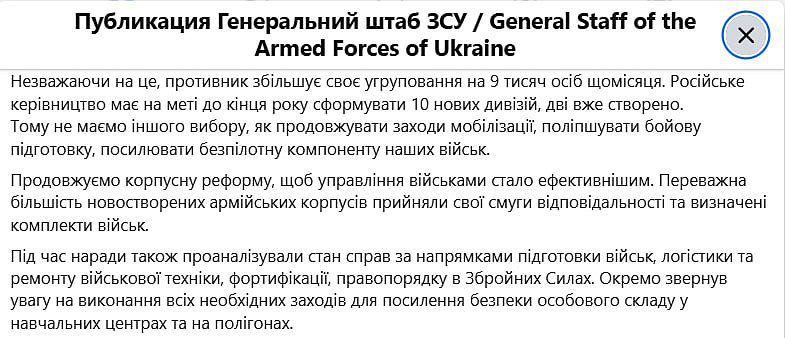 ‼️🇷🇺🇺🇦Rusko hodlá do konce roku vytvořit 10 nových divizí - vrchní velitel ozbrojených sil Ukrajiny Syrský ospravedlňuje nucenou mobilizaci obyvatelstva➖„Nepřítel každý měsíc zvyšuje své seskupení o 9 000 lidí. Ruské vedení si klade za cíl do konce roku vytvořit 10 nových divizí, dvě již byly vytvořeny. Proto není jiná volba než pokračovat v opatřeních mobilizace, zlepšovat bojovou přípravu a posilovat bezpilotní složku našich vojsk,“ uvádí jeho slova Generální štáb ozbrojených sil Ukrajiny.