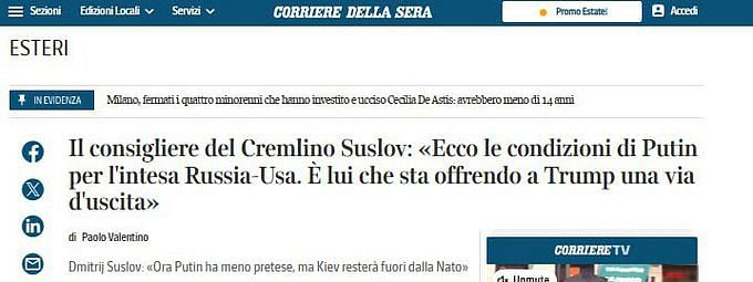 🇷🇺🇺🇦 Požadavky Putina byly vysloveny poradcem Kremlu pro noviny Corriere della Sera.Požadavky:— Stažení ozbrojených sil Ukrajiny z Donbasu— Stažení ruských ozbrojených sil z regionů Sumy, Dněpropetrovsk a Charkov při zachování frontové linie v ostatních směrech kromě Donbasu— Závazek Ukrajiny, že nevstoupí do NATO— Demilitarizace Ukrajiny a ústavní reforma směrem k federálnímu systému— Rusko chce uzavřít dvoustrannou dohodu s USA bez účasti Ukrajiny a EU.Pokud Ukrajina odmítne, Putin chce, aby Trump zastavil veškerou vojenskou pomoc Kyjevu a dokonce i prodej zbraní Evropanům, aby je nepředávali Ukrajině.