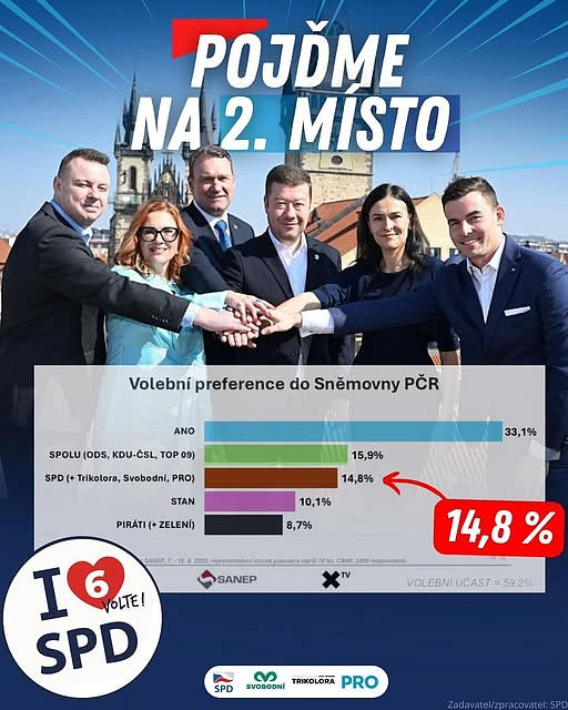 Pojďme na 2.místo! Máme 14,8% a dál prudce stoupáme.📈👍🏻 Spojili jsme se. Pro vás.🙏 Moc Vám děkujeme za důvěru, velmi si vážíme Vaší podpory a budeme nadále ze všech sil bojovat za lepší životy nás všech 🙂