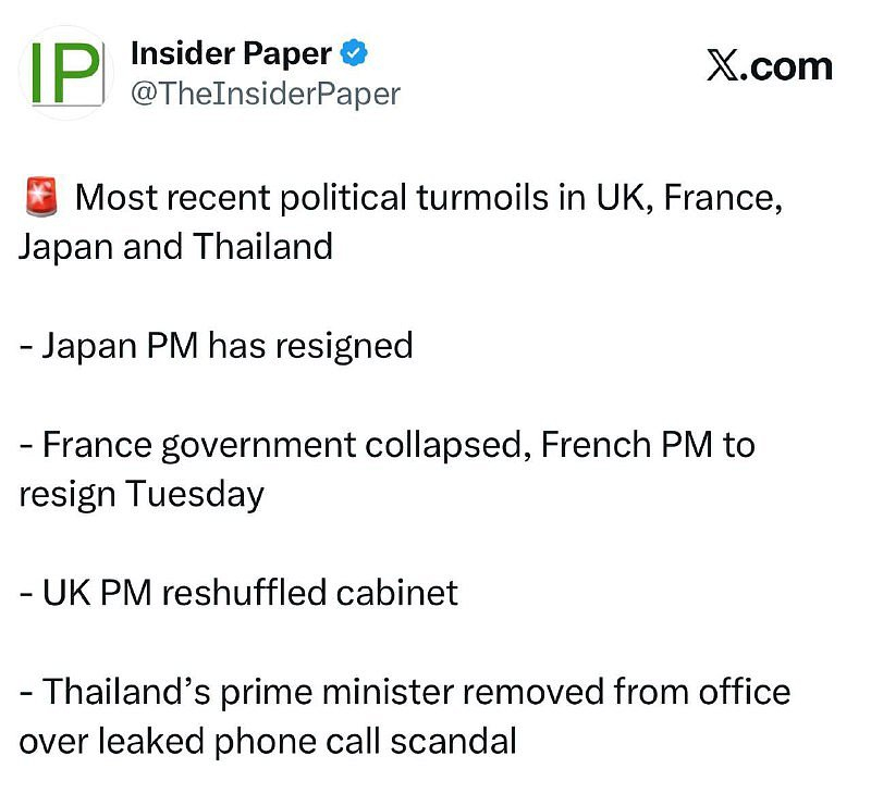 ❗️ 🇬🇧🇫🇷🇯🇵🇹🇭Poslední politické nepokoje ve Spojeném království, Francii, Japonsku a Thajsku- Japonský premiér rezignoval- Francouzská vláda padla, francouzský premiér rezignuje v úterý- Premiér Spojeného království reorganizoval kabinet- Premiér Thajska byl odvolán kvůli skandálu s uniklým telefonátem.