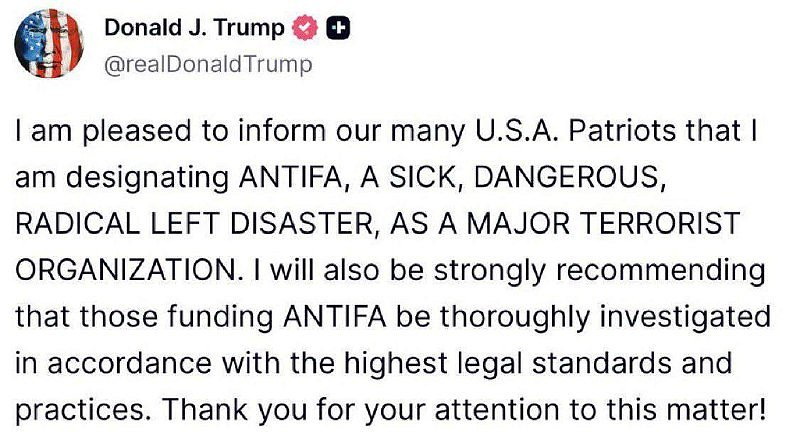🇺🇸🇩🇪 „Antifa“ bude prohlášena za teroristickou organizaci, oznámil americký prezident Donald Trump a zakázal vyšetřování jejích finančníků.Pokud USA skutečně klasifikují Antifu jako teroristickou organizaci, mohlo by být několik politiků v Německu klasifikováno jako členové teroristické organizace.K tomu se přidává státní financování mnoha levicových nevládních organizací. Německá vláda by tak byla předmětem vyšetřování podle „nejvyšších standardů“.Tato zpráva obsahuje mnoho výbušného materiálu.