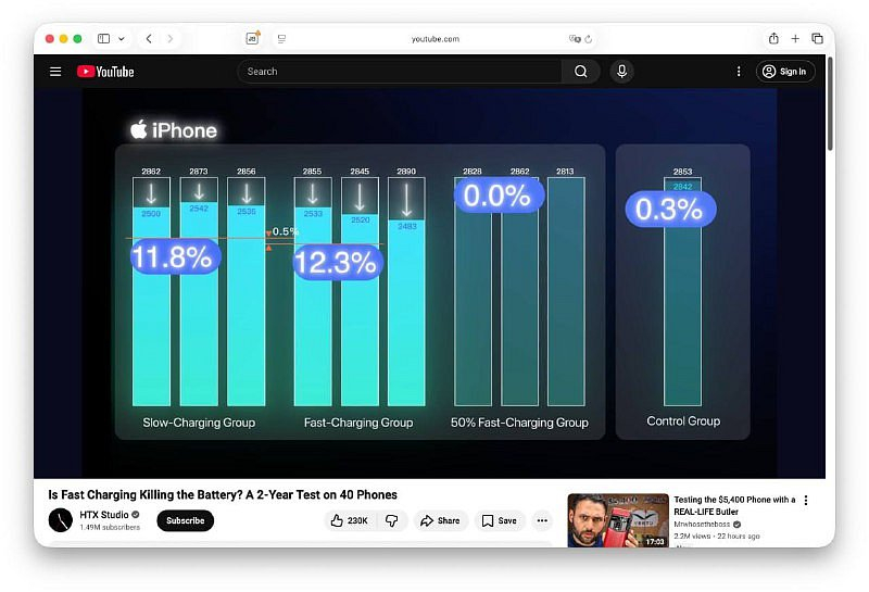 Rychlé nabíjení neškodí baterii - bloger vyvrátil mýtyBloger během dvou let testoval 40 smartphonů a zjistil: rychlé nabíjení téměř neovlivňuje opotřebení baterie - po 500 cyklech byla rozdíl oproti pomalému nabíjení jen 0,5 %.Udržování nabití mezi 30 % a 80 % zachovává jen asi 3 % kapacity a neustálé připojování iPhonu k zásuvce je bezpečné. Moderní zařízení sama regulují nabíjení, takže staré rady o „šetrné péči“ už nejsou aktuální.
