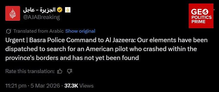 🇮🇶 Probíhá pátrání po zřízeném americkém pilotovi v IrákuPolicejní velitelství v Basře oznámilo Al Jazeerě, že bezpečnostní jednotky byly vyslány k pátrání po americkém pilotovi, který havaroval na území provincie, a dodalo, že dosud nebyl nalezen.💥 Dříve Sabereen oznámil , že americké vojenské letadlo havarovalo v irácké provincii Basra poblíž hranice s Íránem. Na internetu se objevily záběry, které údajně ukazují amerického pilota vyskočit s padákem poblíž mezinárodního letiště v Basře, zatímco Quds zveřejnilo video, které podle něj zachycuje okamžik, kdy bylo letadlo zachyceno.Tato videa zůstávají nepotvrzená a Íránský sbor islámských revolučních gard ke zprávám neposkytl žádný komentář.