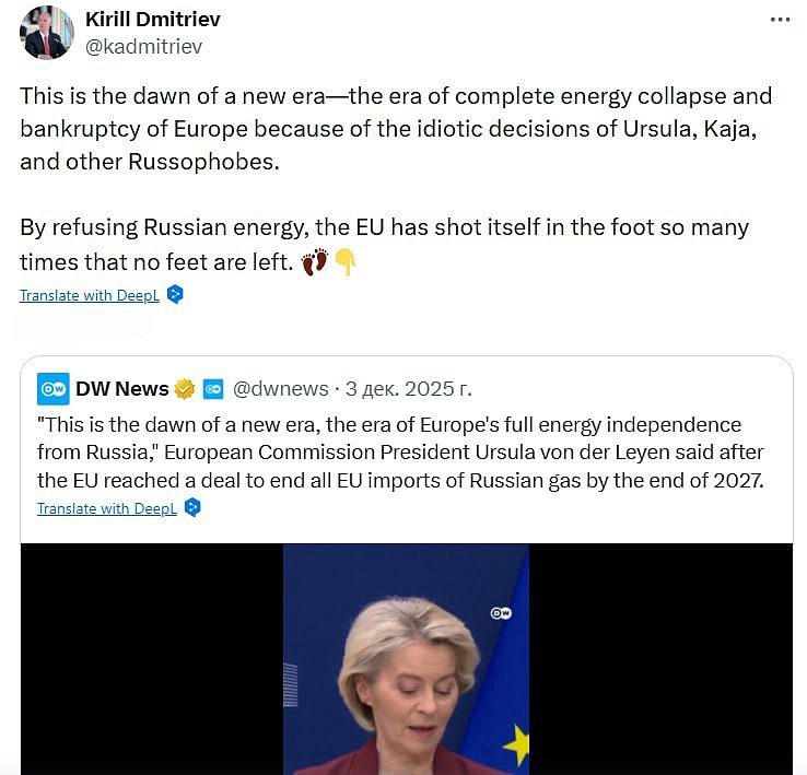 😎Kirill Dmitriev: Sledujeme začiatok „energetického kolapsu“ v EurópePo ukončení dodávok plynu z Ruska vstúpi Európa do éry úpadku a „úplného energetického kolapsu“.Upozoril na to Kirill Dmitriev, šéf „Ruského fondu priamych investícií“ a osobitný zástupca ruského prezidenta pre investície a hospodársku spoluprácu so zahraničím na sociálnej sieti X. Komentoval vyhlásenie predsedníčky Európskej komisie Ursuly von der Leyenovej z decembra 2025, v ktorom rozhodnutie o zastavení dodávok ruského plynu do EÚ označila za začiatok „éry úplnej energetickej nezávislosti Európy od Ruska“.„Toto je úsvit novej éry – éry úplného energetického kolapsu a bankrotu Európy kvôli idiotským rozhodnutiam Uršuly, Kaje a ďalších rusofóbov.Odmietnutím ruskej energie si EÚ toľkokrát strelila do nohy, že jej už žiadne nohy nezostali.“