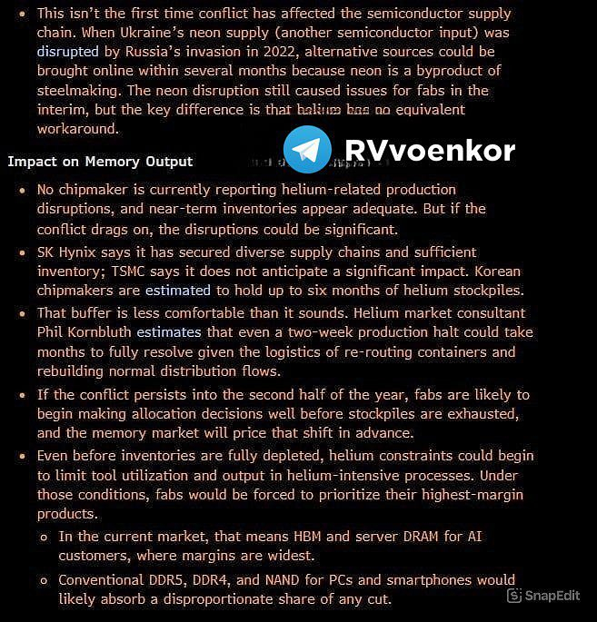 ‼️🇮🇷🏴☠️Uzavření Hormuzského průlivu může vést ke kolapsu AI, americké a světové ekonomiky.▪️Helium se stává nedostatkovým z důvodu uzavření Hormuzského průlivu. A to je kriticky důležitá složka při výrobě lékařského vybavení, počítačových čipů a v několika průmyslových procesech;▪️vzhledem k tomu, že Katar zastavil výrobu LNG, byla zastavena přibližně třetina světové výroby helia. To ovlivnilo výrobce čipů, kteří spoléhají na helium při výrobě polovodičů;▪️helium nemá životaschopnou náhradu při výrobě čipů. Nikdo zatím není schopen nahradit dodávky z Kataru. Kontejnery s heliem uvízly na Blízkém východě;▪️nedostatek helia může vést k tomu, že výrobci čipů budou upřednostňovat produktové řady s nižší marží, což prohloubí vážný nedostatek zařízení pro počítačovou a mobilní paměť;▪️to bude znamenat konec pro společnosti zabývající se umělou inteligencí, protože to naruší všechny plány na výstavbu datových center;▪️zastavení výstavby datových center může vést k prasknutí bubliny umělé inteligence a kolapsu americké a, tudíž, světové ekonomiky.