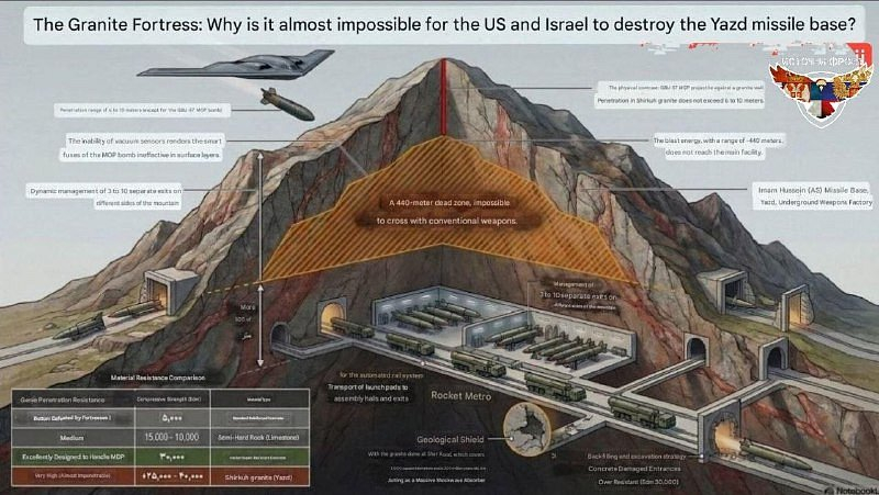 🇮🇷Jeden z raketových měst Íránu je zakopaný v hloubce 500 metrů v žulové hoře v Jazdu🔵Nejmocnější americká protibunkrová bomba — GBU-57 MOP proniká 60 metrů do betonu. Objekt se nachází v hloubce 440 metrů. Čísla nedávají šanci.🔴Mnoho východů z tunelu na různých stranách hory. Vnitřní železniční systém.🔴Skála stará 300 milionů let. Hodnocení pevnosti — 125 000 EDM. 25krát pevnější než železobeton.