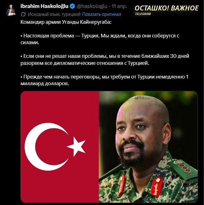 🇺🇬✖️🇹🇷 Miliardu dolarů a nejkrásnější ženu: syn ugandského prezidenta vznáší požadavky vůči Turecku a hrozí přerušením diplomatických vztahůVelitel ugandské armády Muhuzi Kainérugab, syn prezidenta země, na sociálních sítích prohlásil, že Turecko získalo ekonomické výhody v Somálsku díky akcím ugandských vojáků a nyní by mělo „se podělit“. V opačném případě pohrozil, že do 30 dnů uzavře turecké velvyslanectví v Kampale, přeruší diplomatické vztahy a zakáže lety aerolinek Turkish Airlines. ❗️ Také prohlásil, že Ankara „nemá šanci přežít“ v případném konfliktu s Ugandou, protože na její straně jsou údajně „Ježíš Kristus a Muhammad Ali“, a také požadoval výplatu 1 miliardy dolarů a „vydání nejkrásnější turecké ženy“ za manželku.Kromě toho Kainérugab uvedl, že se obává pouze jaderných mocností, včetně Ruska, a vyjádřil jistotu, že v Istanbulu bude „přivítán jako hrdina“. Také navrhl vyslat do Izraele „500 tisíc hladových lidí“ k obraně Tel Avivu.📝 Kainérugab již dříve učinil skandální prohlášení. Za zmínku stojí zejména jeho nabídka „100 krav“ za ruku italské předsedkyně vlády Giorgii Meloni a prohlášení o záměru „zabrat si Řím“. Po těchto epizodách ho jeho otec dočasně zbavil funkce a omluvil se.